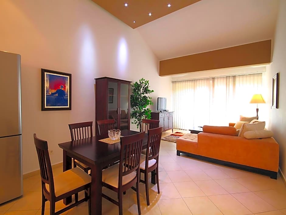 This air-conditioned apartment features a living room with a flat-screen TV and kitchen facilities, while the sleeping area is on the open gallery upstairs.